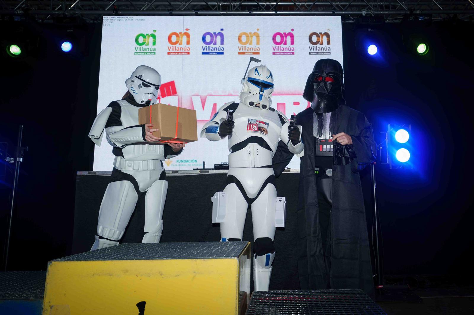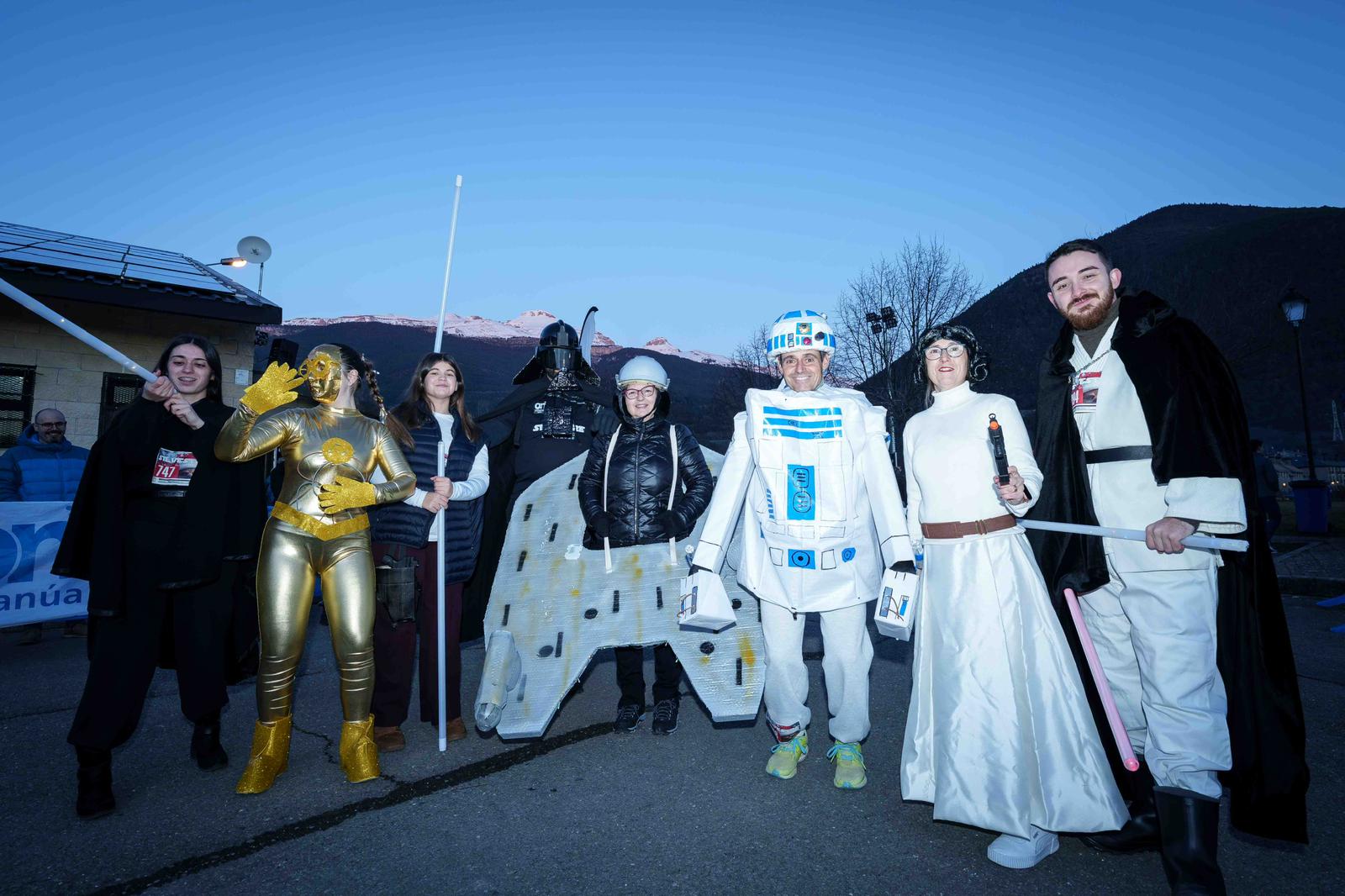Tras el selecto grupo de corredores que había marcado en rojo en sus calendarios la cita de Villanúa para mantener su tono competitivo o preparar futuros retos, se encontraba una inmensa mayoría cuya única aspiración era cubrir los tres kilómetros de la prueba de manera divertida y tirando de ingenio. Y muchos de ellos hicieron una verdadera exhibición de originalidad y creatividad. Este año la organización había propuesto como temática de los disfraces la saga de Star Wars, la elección era libre, pero quienes optaron por aceptar el reto ofrecieron un catálogo memorable de guiños a la famosa creación de George Lucas que fue valorada y reconocida por el jurado.